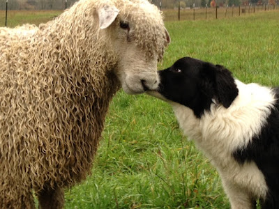 Today during a break from the rain, my Border Collie Pete and I went out into one of the pastures. My ram lambs were very curious and came over to investigate. Here one of them is getting a kiss!